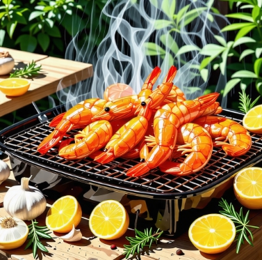 - 구운 대하에 레몬즙을 뿌리고 신선한 허브 잎을 곁들여 마무리합니다.