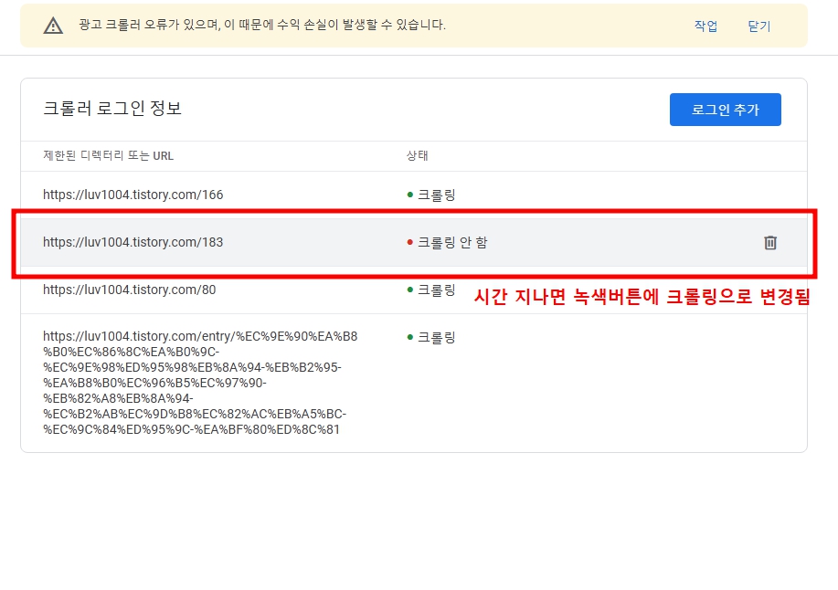 자 이제 이렇게 떴으면 끝난거에요. 시간이 지나면 크롤링안함의 빨간색 동그라미가 녹색 동그라미로 전환되면서