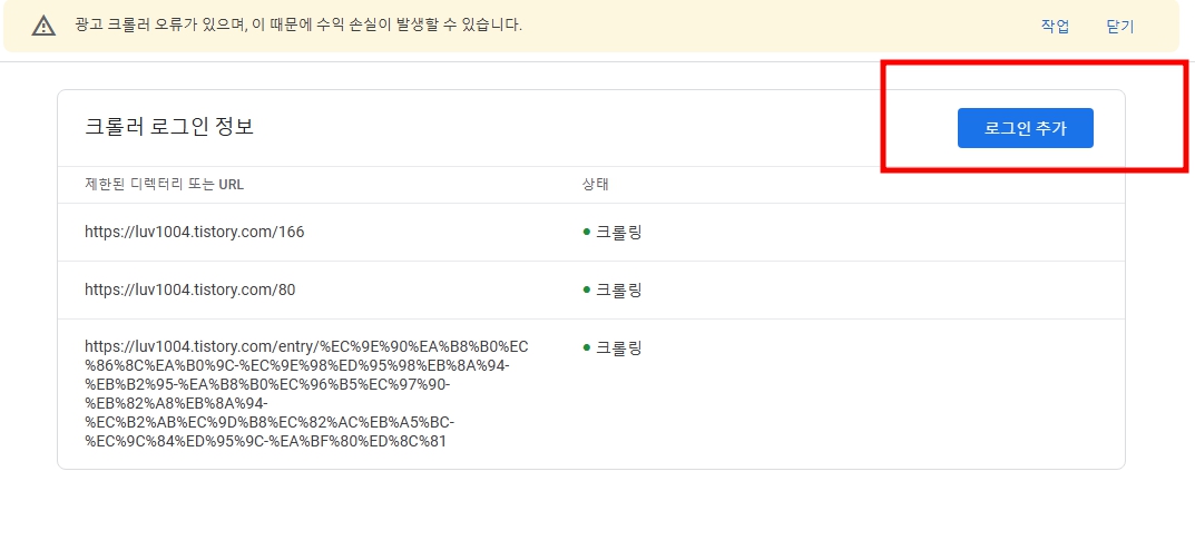 잘 보시면 크롤러 액세스가 있어요. 이 탭 을 눌러 진입해보세요.