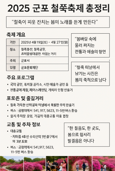 2025 군포 철쭉축제 일정, 장소, 입장료, 프로그램, 교통, 주차까지 완벽 정리! 봄을 알리는 철쭉의 향연 속으로 당신을 초대합니다.